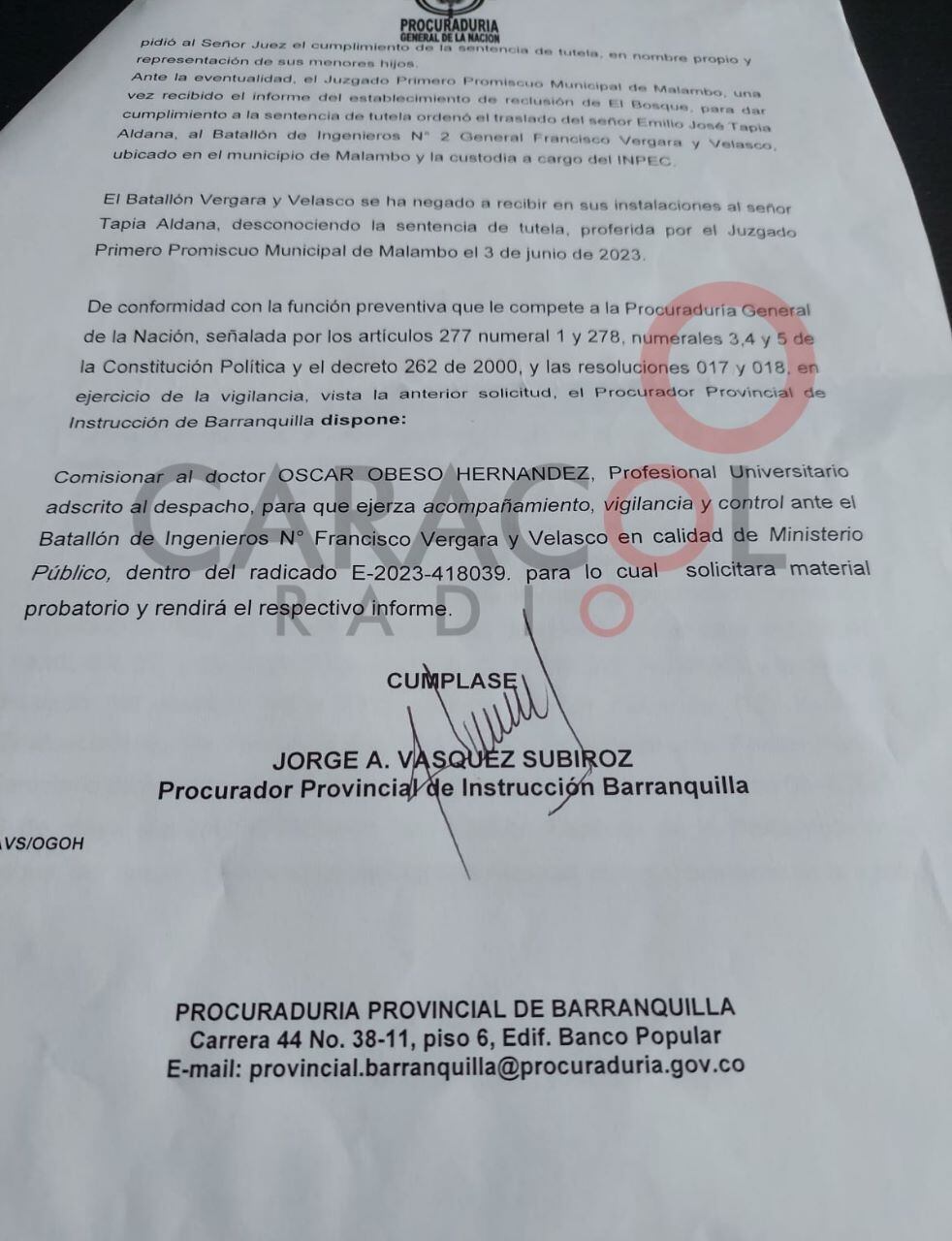 Caracol Radio conoció en primicia el documento por el cual el destituido procurador provincial de Barranquilla, Jorge Vásquez, ordenó las acciones que buscaban favorecer el traslado de Emilio Tapia a un batallón militar en el Atlántico.