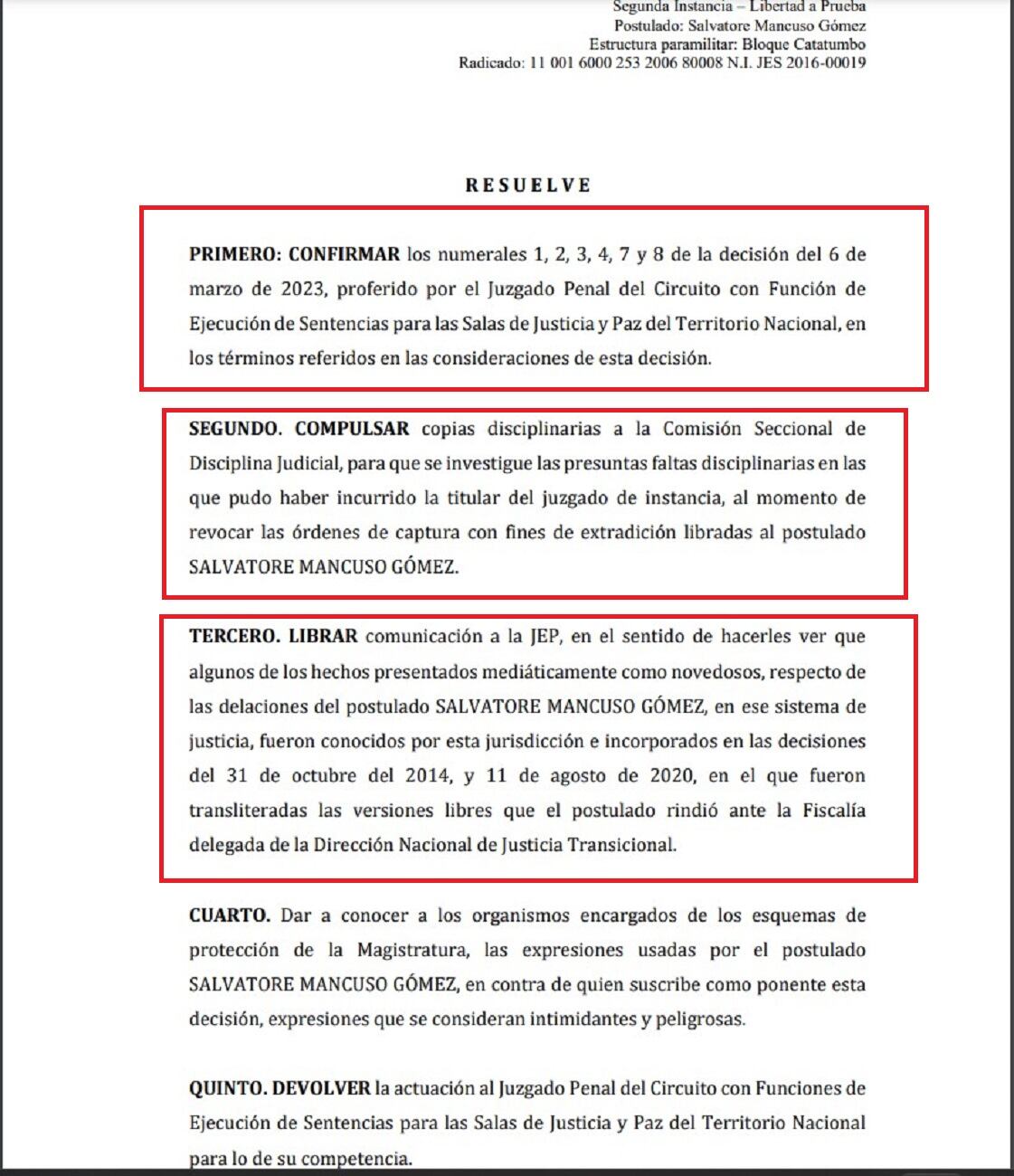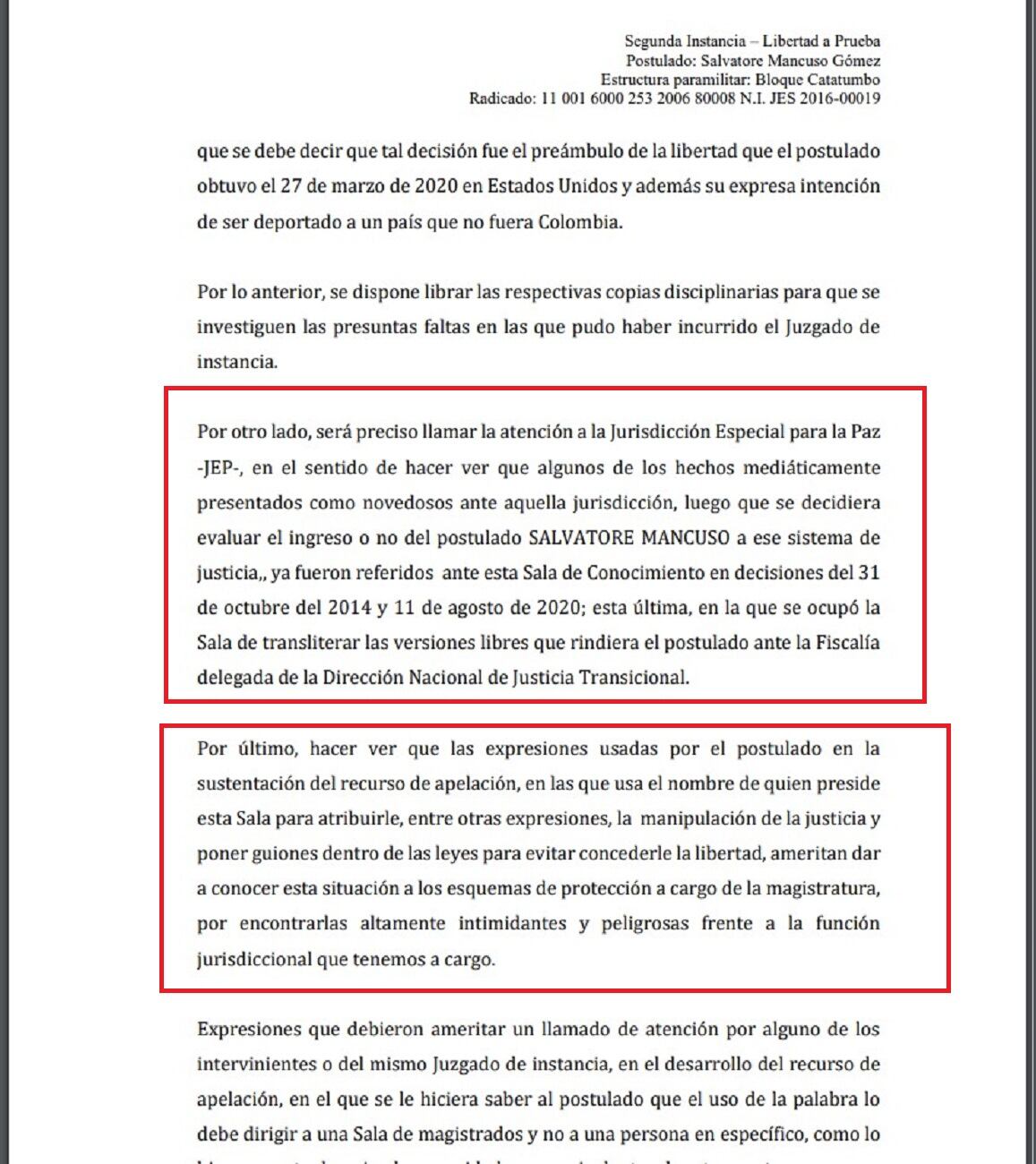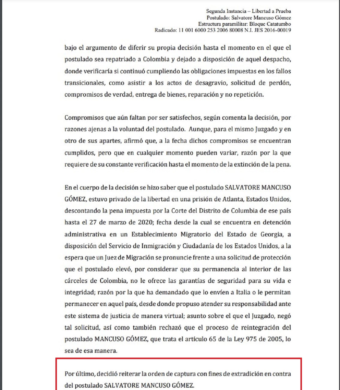 Al resolver un recurso de apelación, una magistrada de la Sala de Justicia y Paz de Bogotá, dejó en firme la orden de captura con fines de extradición en contra del exjefe paramilitar Salvatore Mancuso Gómez. Eso quiere decir que, debe regresar a pagar dos sentencias por miles de crímenes cometidos en Colombia.