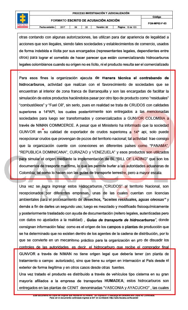 “La empresa NIMAN COMERCE fue creada única y exclusivamente para la adquisición de crudos para GUNVOR COLOMBIA y sería NIMAN el encargado de la adquisición de los productos a través de terceros; es decir realiza la compra, comercialización a través de las empresas SWIS TERMINAL, CI LA OPERADORA, CI PETROWORD, CRUDESAN, COLCRUDOS, KRISTALEGERYI, entre otras, con conocimiento de que sus proveedores no cuentan con autorización del Ministerio de Minas para este tipo de hidrocarburos, esto es crudo con API superior a 14°” dice el documento.
