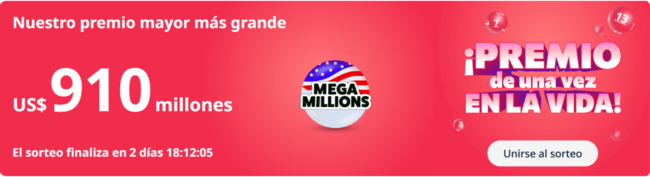 El récord del premio mayor más grande de Mega Millions es actualmente de US$ 1,53 mil millones y fue reclamado por un solo boleto comprado en Carolina del Sur en 2018. Con el premio mayor actual de US$ 910 millones, ¡Mega Millions se está acercando rápidamente a romper récords!