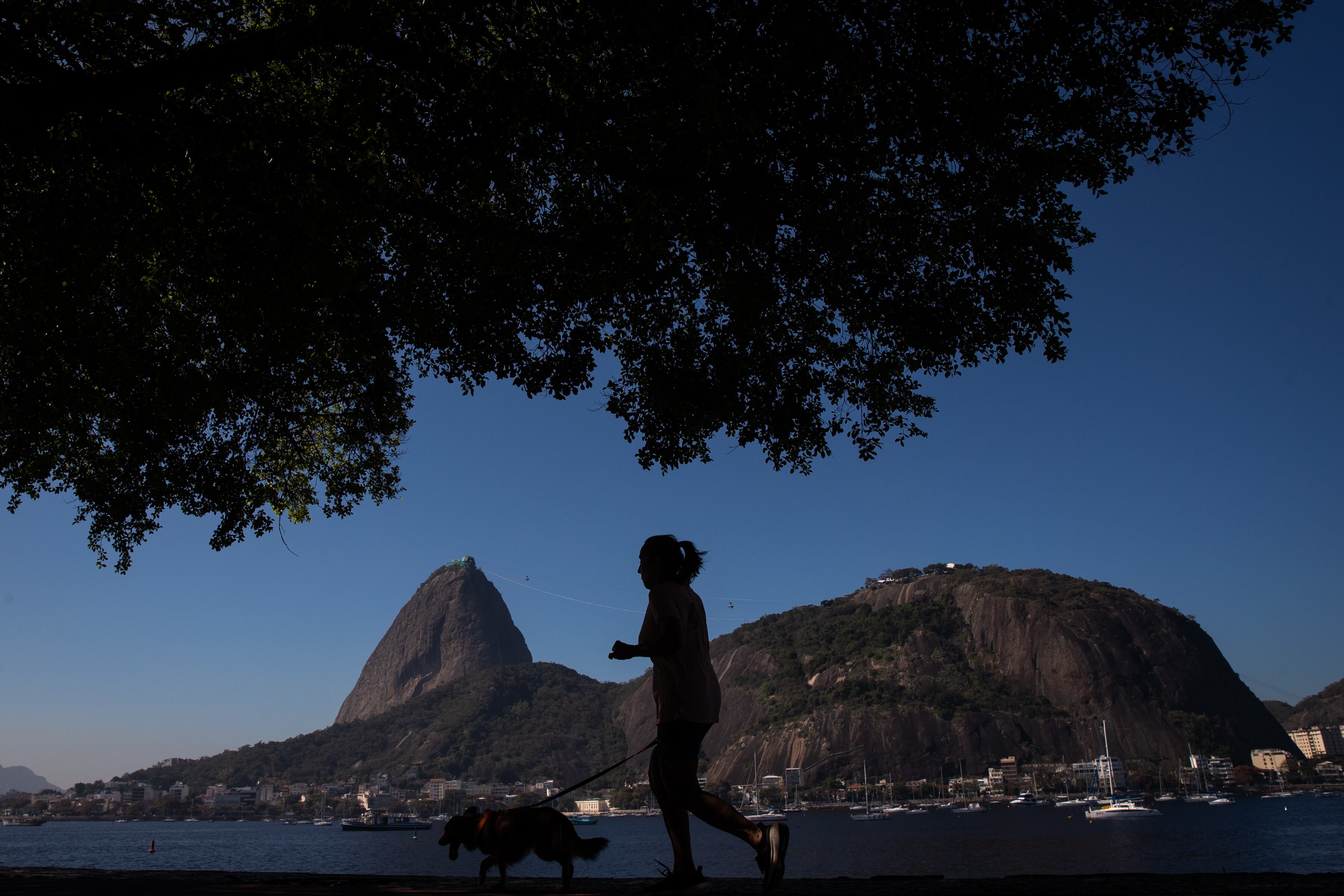 AME7503. RÍO DE JANEIRO (BRASIL), 02/08/2023.- Una mujer trota hoy con su perro por Botafogo, con las montañas del Pan de Azúcar al fondo, en Río de Janeiro (Brasil). EFE/André Coelho / ANDRE COELHO