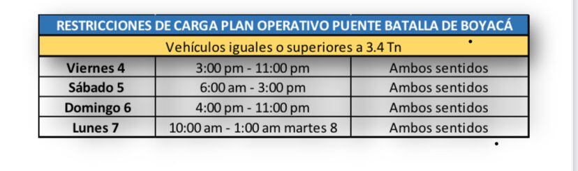 Además, para disminuir el tránsito de vehículos de carga, se fijaron los siguientes horarios para prohibir el tránsito de carga superior a las 3.4 toneladas.