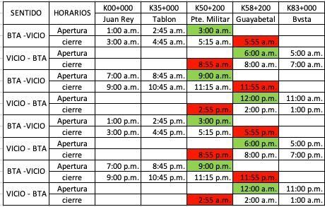 Tenga en cuenta los horarios para transitar por el puente militar instalado en El Naranjal serán cada tres horas, sin embargo, se le recomienda a los usuarios revisar los cierres el kilómetro 0 y en el kilómetro 83.