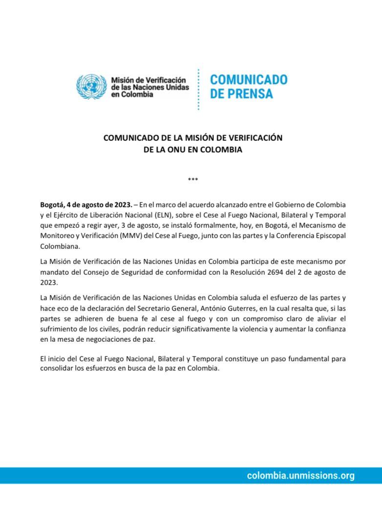 Además, Naciones Unidas también ha resaltado su disposición de extender la Misión en caso de encomendarle la tarea de monitorear la implementación de un posible acuerdo entre el Gobierno de Colombia y el Estado Mayor Central.