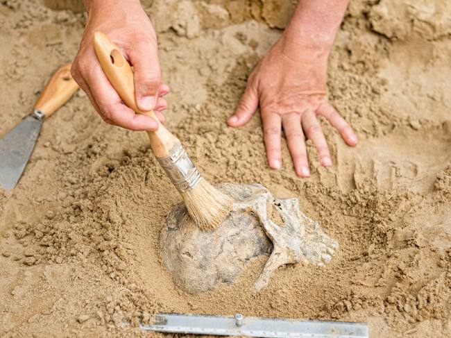 Manos de un antropólogo que revelan el cráneo humano de la suciedad / Getty Images / microgen