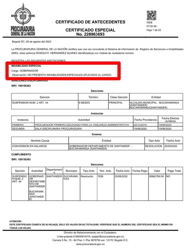 A través de una sentencia disciplinaria en segunda instancia, la Procuraduría General de la Nación confirmó que Rodolfo Hernández, candidato a la gobernación de Santander no está inhabilitado.