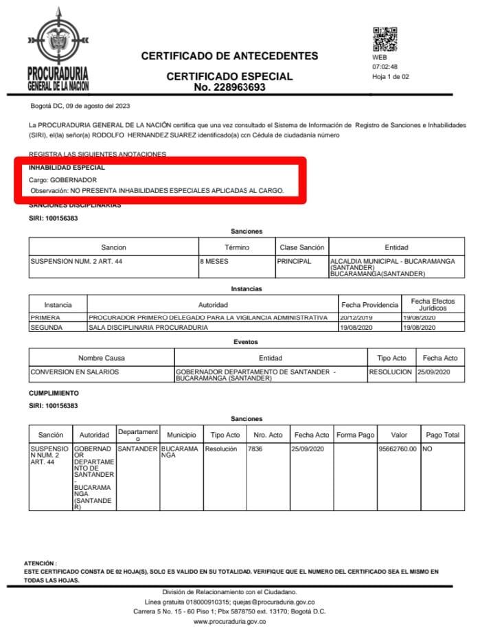 A través de una sentencia disciplinaria en segunda instancia, la Procuraduría General de la Nación confirmó que Rodolfo Hernández, candidato a la gobernación de Santander no está inhabilitado.