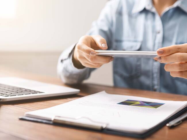 Mujer tomándole foto a un documento con su celular (Getty Images) / Konstantin Postumitenko
