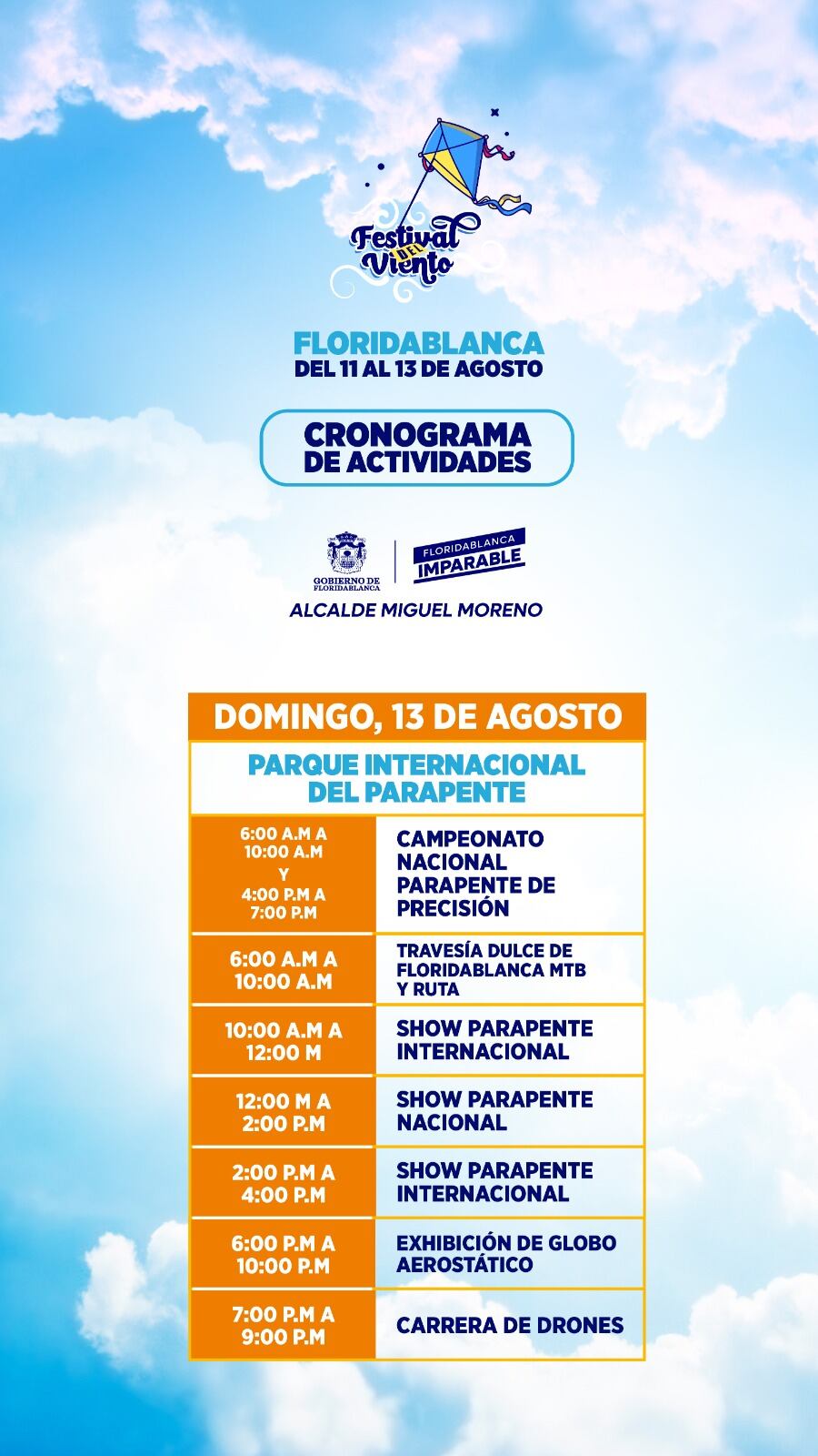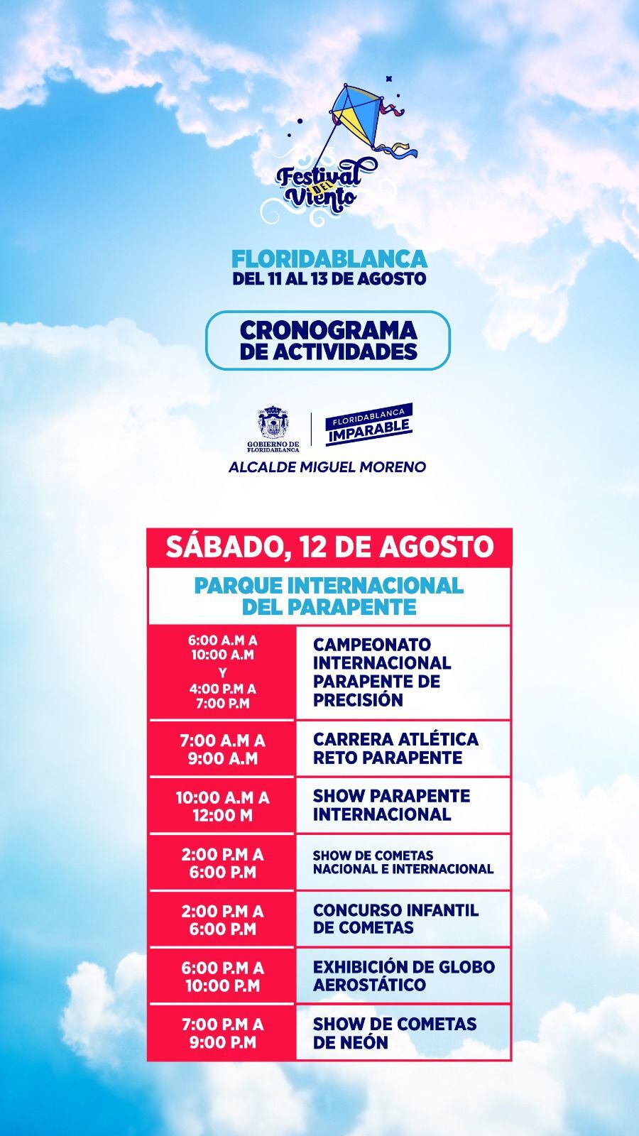 Durante el sábado 12 y el domingo 13 de agosto se contará con la participación de parapentistas de la región, del país e internacionales que harán parte de shows de parapente y campeonatos nacionales que incluyen exhibiciones extremas.