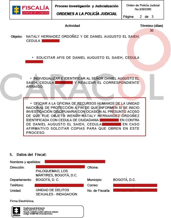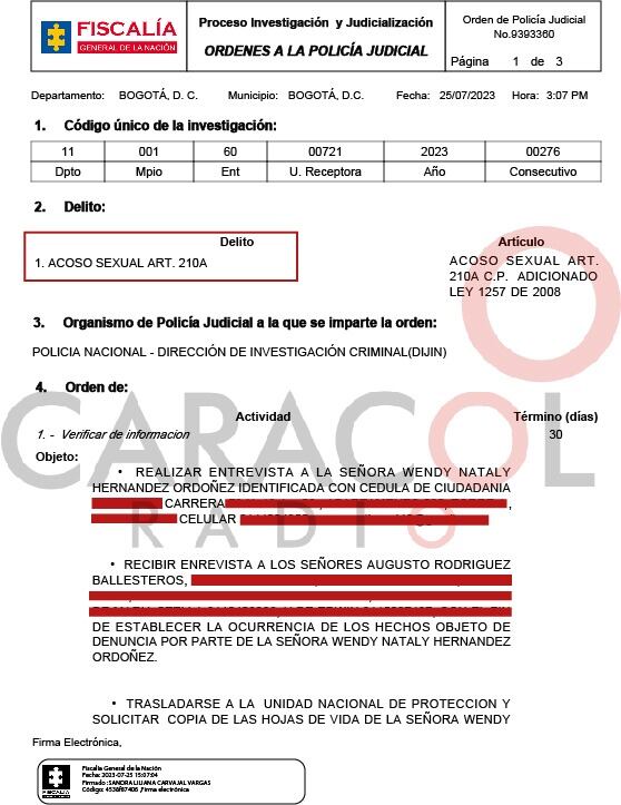 La instrucción a Policía Judicial conocida por Caracol Radio, ordena realizar entrevista a la presunta víctima, Wendy Nataly Hernández, una abogada y excontratista, quien, en mayo de este año, denunció al jefe jurídico Elsahieh Sánchez.