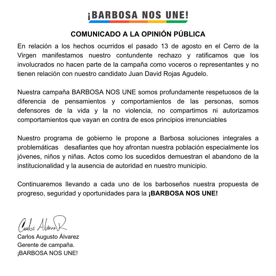 Caracol Radio contactó a la oficina de prensa del candidato Rojas para conocer su opinión sobre esta situación y trasladaron un comunicado en el que el político indica que rechaza la actitud y comportamiento del hombre “manifestamos nuestro contundente rechazo y ratificamos que los involucrados no hacen parte de nuestra campaña como voceros o representantes y no tiene relación con nuestro candidato Juan David Rojas Agudelo”.
