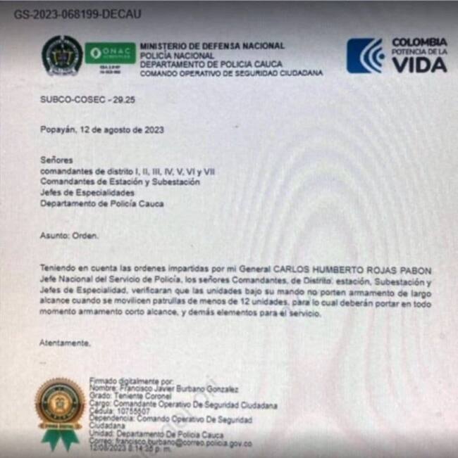 “La instrucción que tenemos es que a las áreas rurales, lo único que se tiene con ello es, primero las medidas, el despazamiento y tercero que más de 10 hombres, especialmente para las zonas rurales, se deba llevar y se deba cumplir esto (...) Lo único que queremos es garantizar la vida de nuestros uniformados para garantizar la vida de los colombianos”.
