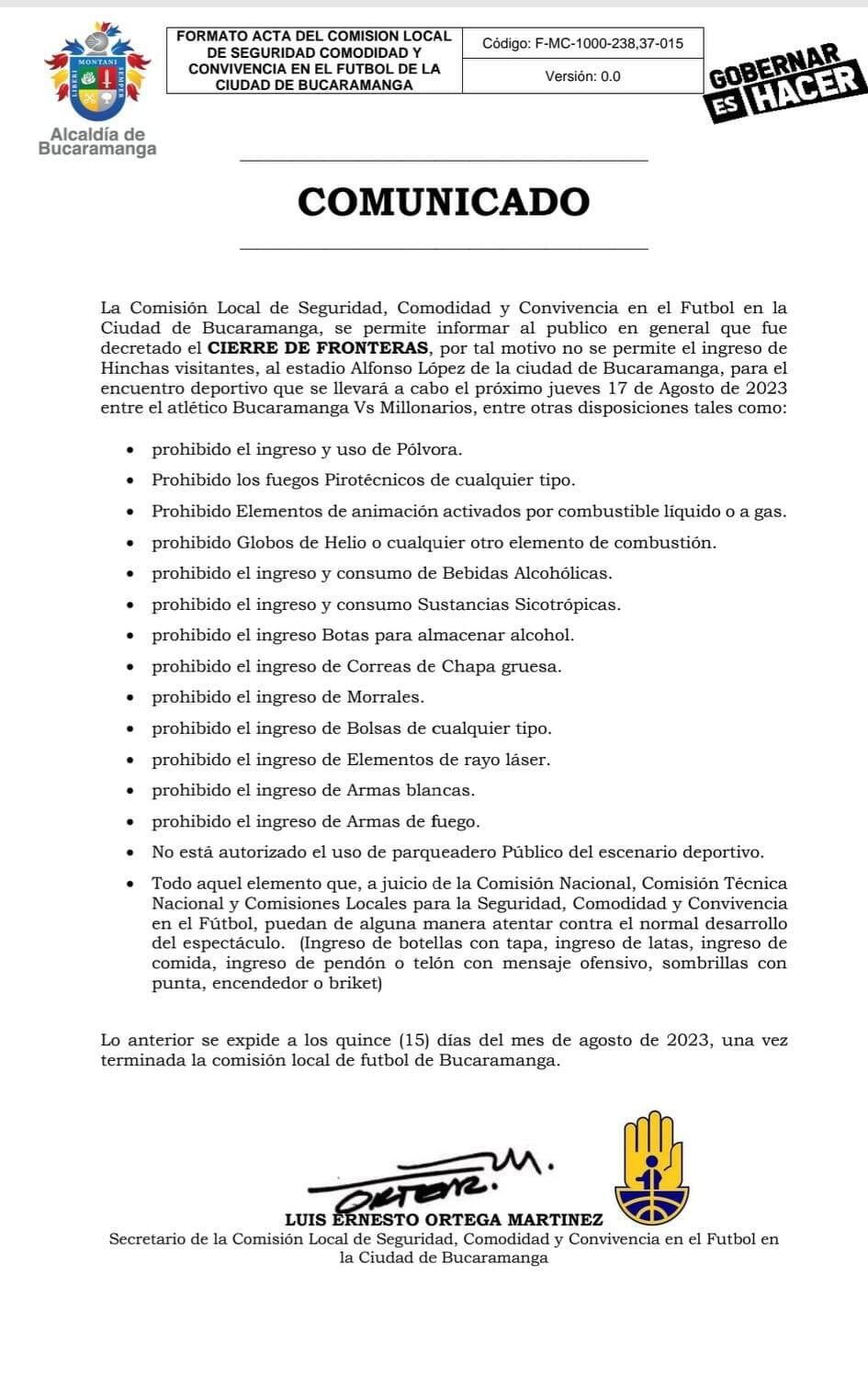La comisión local de seguridad, comodidad y convivencia en el fútbol decretó un cierre de fronteras para el partido que se jugará hoy en la capital santandereana entre el Atlético Bucaramanga - Millonarios por Copa Betplay.