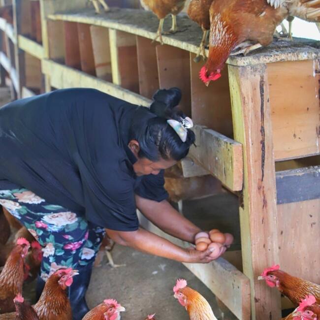 Con la entrega de 250 nuevas gallinas ponedoras, que se suman a otras 495 que recibieron en diciembre de 2022, firmantes de paz del municipio de Turbaco y sus familias consolidan un emprendimiento económico que les permite surtir tiendas y pequeños comercios del municipio.