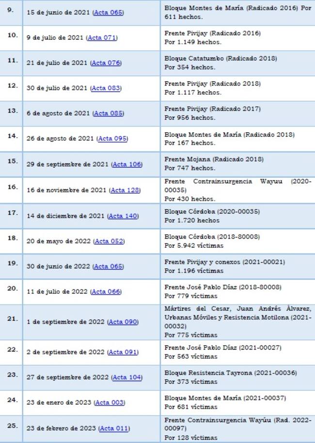 Sobre estos procesos consultamos con la sala de Justicia y Paz del Tribunal, y se encuentran en la sala de conocimiento para para la legalización de los cargos, cuantificación de los perjuicios y emisión de la respectiva sentencia.