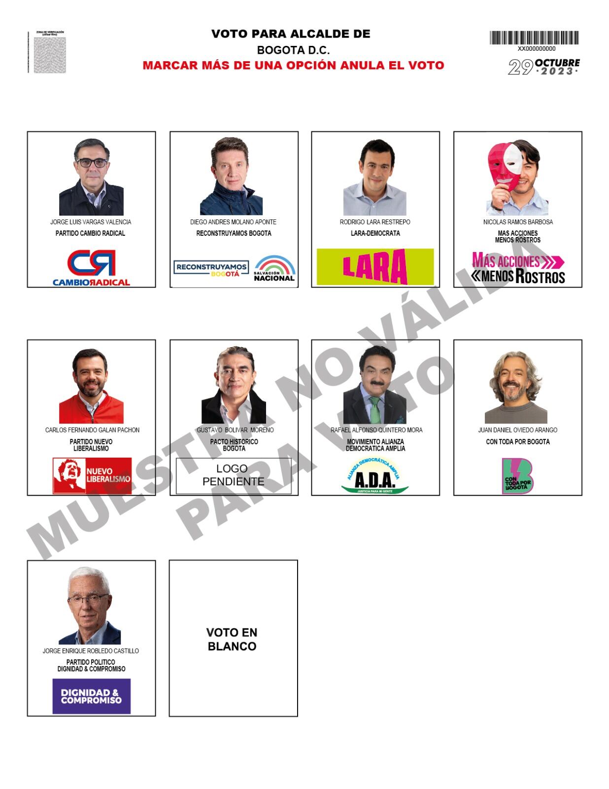 Luego de realizarse el sorteo aleatorio de ubicación de los candidatos a la alcaldía de Bogotá para las elecciones del 29 de octubre, la Registraduría dio a conocer cómo quedó definido el tarjetón. Este contará con 10 casillas, incluyendo el voto en blanco y estará encabezado por el candidato de Cambio Radical, Jorge Luis Vargas.