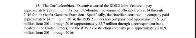 “15. El Ejecutivo de Corficolombiana hizo que el Consorcio RDS 2 pagara aproximadamente 28 millones de dólares en sobornos a funcionarios del gobierno colombiano entre 2014 y 2016 por la Extensión Ocaña-Gamarra. Específicamente, la constructora brasileña pagó aproximadamente $4 millones en 2014; la concesionaria RDS 2 pagó aproximadamente $13,2 millones desde 2014 hasta 2016 (aproximadamente $2,7 millones a través de un banco corresponsal ubicado en Estados Unidos), y la constructora RDS 2 pagó aproximadamente $10,9 millones desde 2014 hasta 2016.”