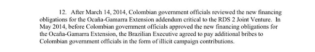 “12. Después del 14 de marzo de 2014, los funcionarios del gobierno colombiano revisaron las nuevas obligaciones de financiamiento para el otrosí de la extensión Ocaña-Gamarra que era fundamental para el Consorcio RDS 2. En mayo de 2014, antes de que funcionarios del gobierno colombiano aprobaran las nuevas obligaciones financieras para la ampliación Ocaña-Gamarra, el Ejecutivo brasileño acordó pagar sobornos adicionales a funcionarios del gobierno colombiano en forma de contribuciones ilícitas a la campaña”. (Ver imagen2.jpg)
