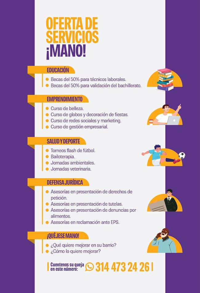A través de la fundación ‘Mano a Mano’ están entregando en las calles de Bucaramanga un volante en donde están ofreciendo algunos servicios como becas estudiantiles, cursos para emprendedores, torneos deportivos y atención jurídica y allí aparece un número de teléfono para comunicarse y recibir mayor información. Esto, sería para beneficiar la campaña a la alcaldía de Bucaramanga del candidato Fabián Oviedo.