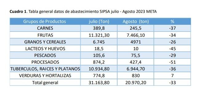 “Según los datos del SIPSA se presenta una reducción generalizada del -33% de la oferta de productos alimenticios originados del Meta; Y para el caso de la Corporación de Abastos de Bogotá una reducción promedio del -32,5% de productos producidos y procesados en este departamento” indicó la corporación.