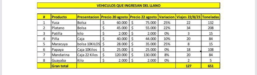 Asimismo, Corabastos indicó que se le está dando prioridad a los camiones que llegan del Llano para evitar que haya pérdidas de productos debido a los cambios de temperatura y a los largos recorridos que tienen que hacer los transportadores.