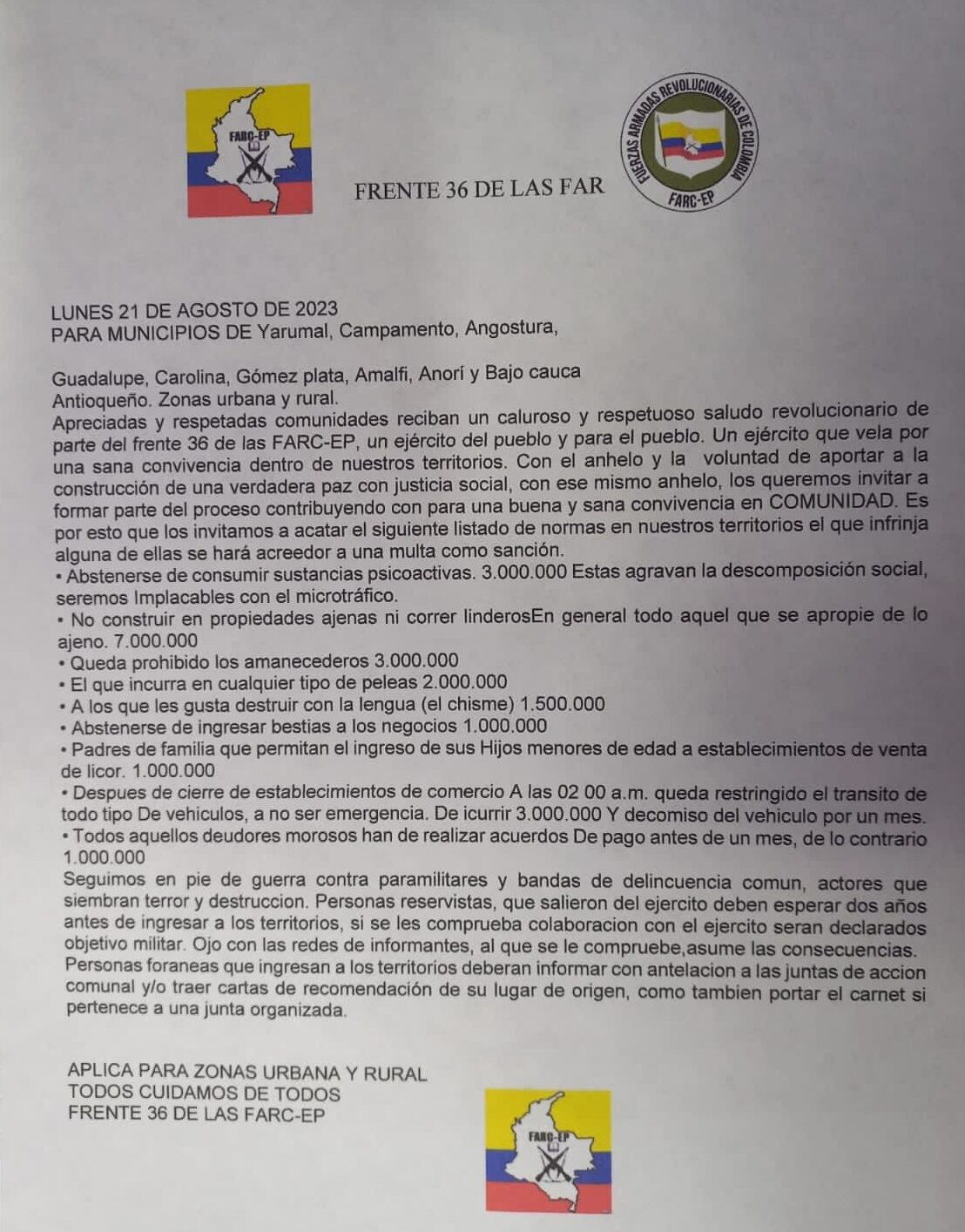 Como lo habían anunciado los frentes 18 y 58 de las disidencias que habían activado cobros millonarios a quienes incumplan sus nuevas ´reglas de convivencia’, el frente 36 hizo lo mismo, pero para otros seis municipios del Norte, los seis del Bajo Cauca y dos del Nordeste. Así lo comunicó el grupo ilegal en el más reciente panfleto que circula por esos territorios. Así pretenden suplantar a las autoridades.