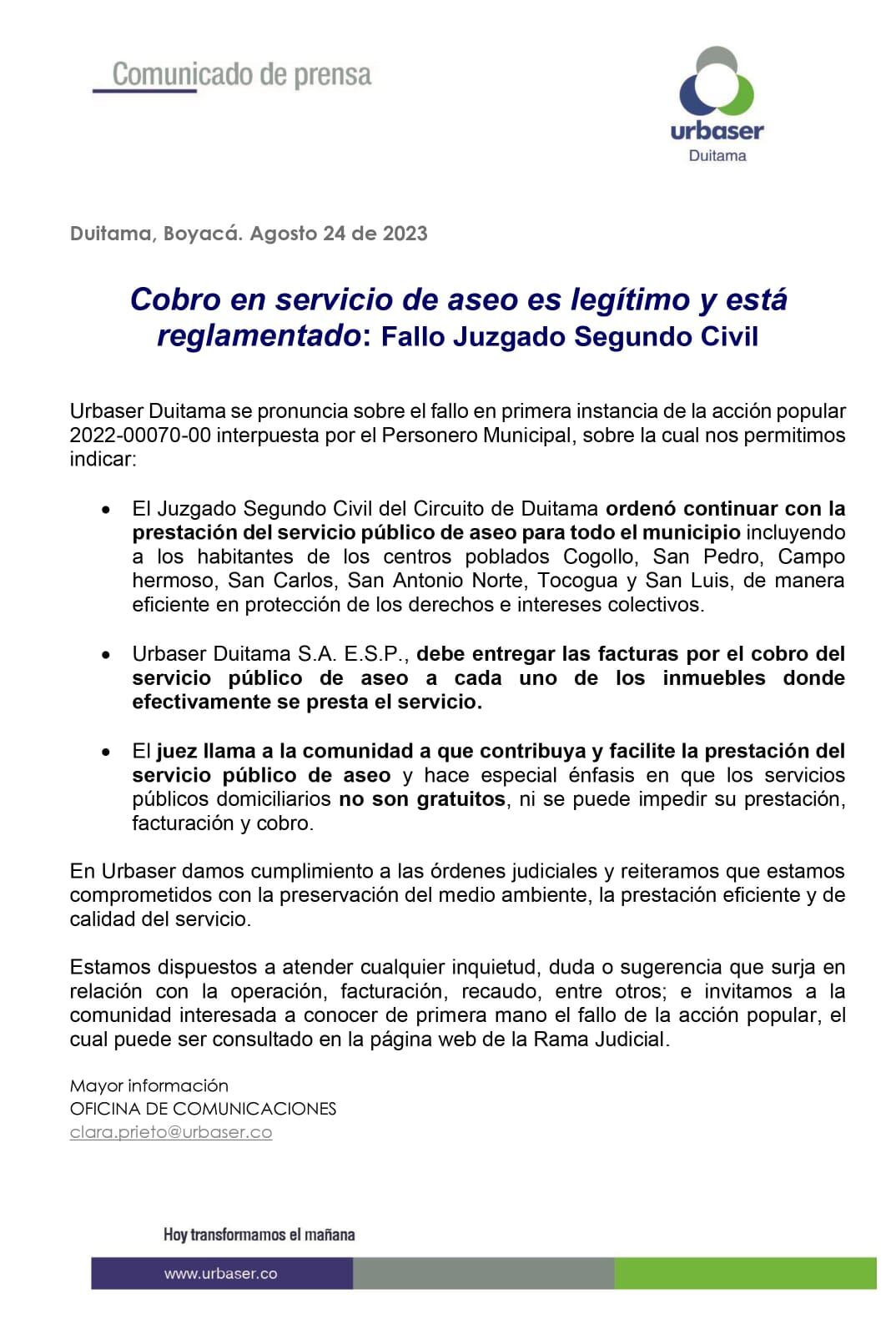 Por su parte, Yaneth Álvarez Moreno, gerente de Urbaser Duitama, afirmó que están conformes con el fallo y no apelarán, así explicó su decisión y el alcance de la providencia.