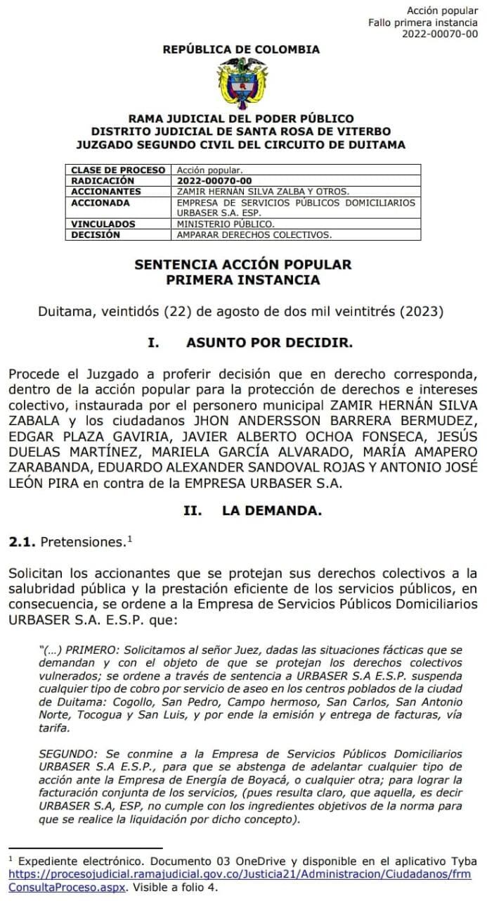 EL personero de Duitama Zamir Silva y algunos presidentes de Junta de Acción Comunal de Duitama, decidieron interponer Acción Popular contra la Empresa de Servicios Públicos domiciliarios Urbaser S.A. ESP. Buscando la protección de derechos e intereses colectivos de las comunidades en los centros poblados dSegún el documento, son por lo menos tres pretensiones, una, busca que: “Se ordene a través de sentencia a Urbaser S.A E.S.P. suspenda cualquier tipo de cobro por servicio de aseo en los centros poblados de la ciudad de Duitama: Cogollo, San Pedro, Campo hermoso, San Carlos, San Antonio Norte, Tocogua y San Luis, y por ende la emisión y entrega de facturas, vía tarifa”.