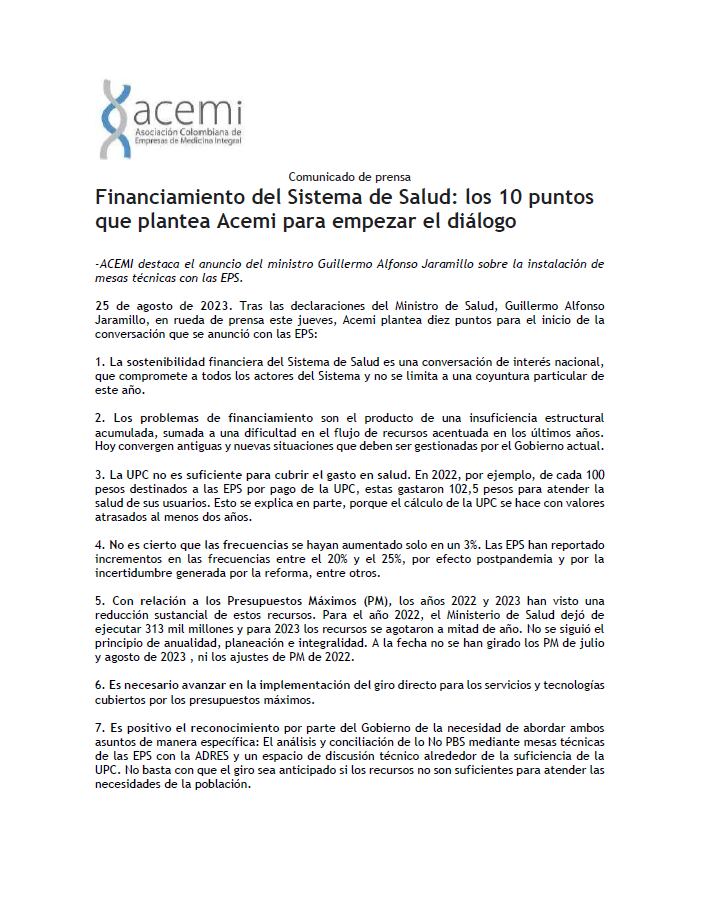 Desde ACEMI se pronunciaron frente a los anuncios del ministro de salud, Guillermo Alfonso Jaramillo, sobre la instalación de mesas técnicas con las EPS, planteando diez puntos para acceder a un eventual inicio de conversaciones.
