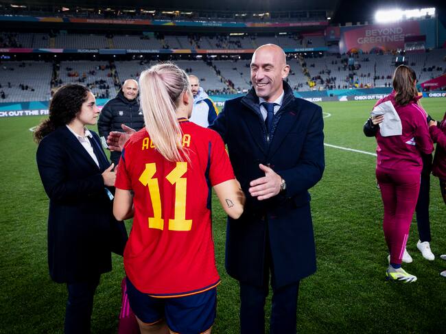 El presidente de la Real Federación Española de Fútbol, Luis Rubiales (c), celebra a la centrocampista de la selección española de fútbol femenino Alexia Putellas (2i) después de que el equipo se impusiera a Suecia en la semifinal del Mundial femenino de fútbol este martes en Auckland (Nueva Zelanda). EFE/Pablo García/RFEF / Pablo Garcia/RFEF (EFE)