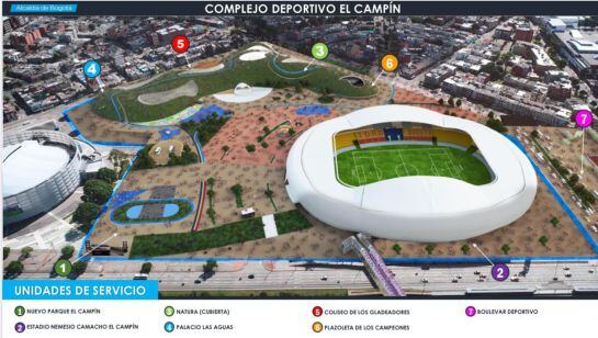 Las obras de este proyecto de remodelación del escenario deportivo más importante de Bogotá incluyen la creación de una sección de tribunas nuevas adecuadas a las exigencias de la FIFA, un condicionamiento de las tribunas para aumentar la capacidad de 39 mil a 50 mil personas, y una renovación urbanística completa del sector, que contempla la adecuación de la sede de la Filarmónica, una zona de restaurantes, un espacio comercial, y área de oficinas administrativas.