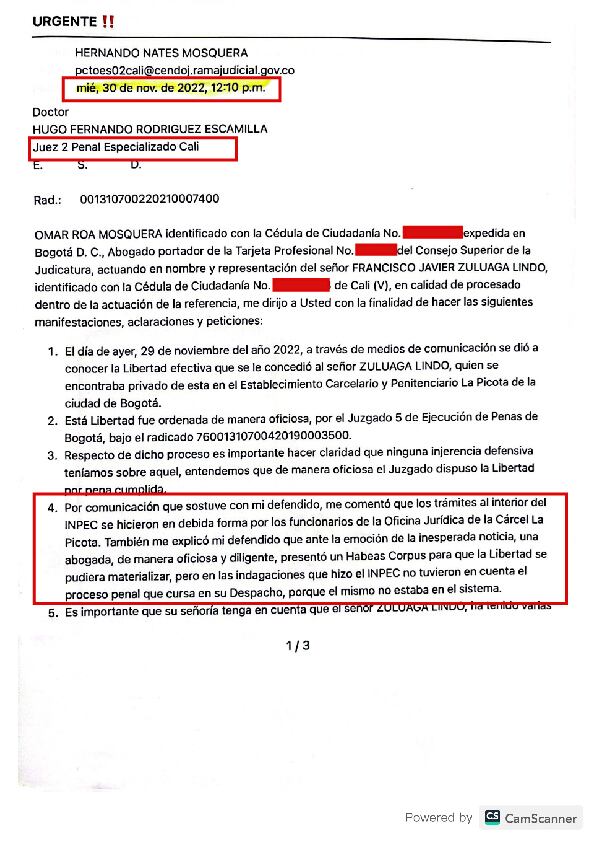 El miércoles 30 de noviembre de 2022, a las 12:10 pm, el abogado Hernando Nates, envió un correo al juez segundo Especializado de Cali, en el que notificó que su cliente, Francisco Javier Zuluaga Lindo, alias ‘Gordo Lindo’, el día anterior había quedado en libertad.