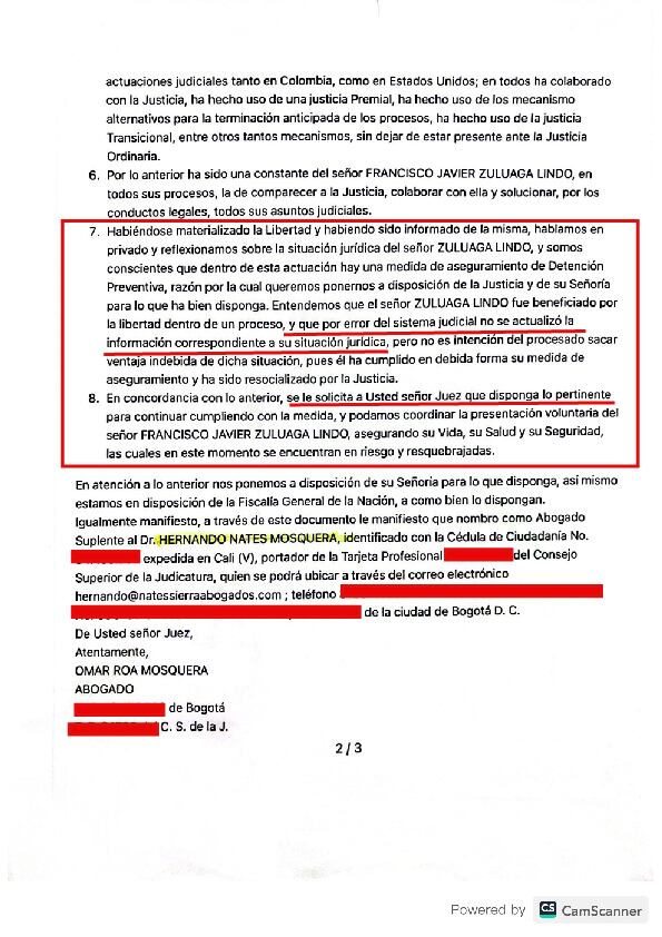 En ese mismo correo, el abogado Nates reconoció ante ese juez que, tras una conversación con su cliente sobre su situación jurídica, eran conscientes que dentro de las actuaciones judiciales existía una medida de aseguramiento en detención preventiva, y que, en el sistema judicial no estaba actualizada la información correspondiente.