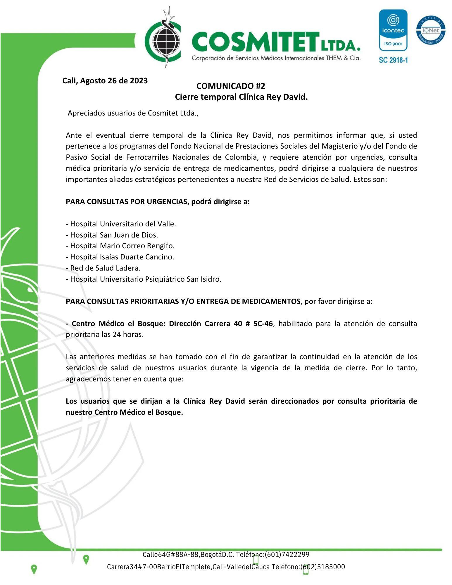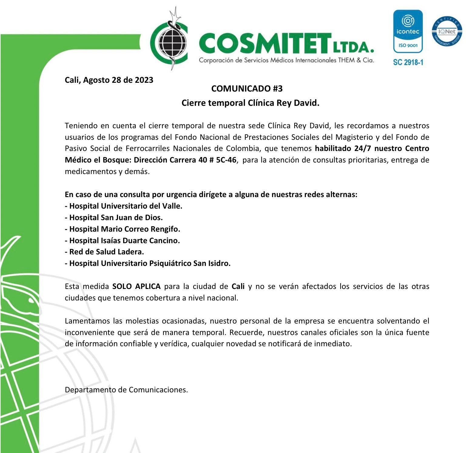 Se trata de la Clínica Rey David de la empresa Cosmitet, que bajo el argumento de vivir una situación administrativa determinó el cierre temporal de sus servicios en Cali.