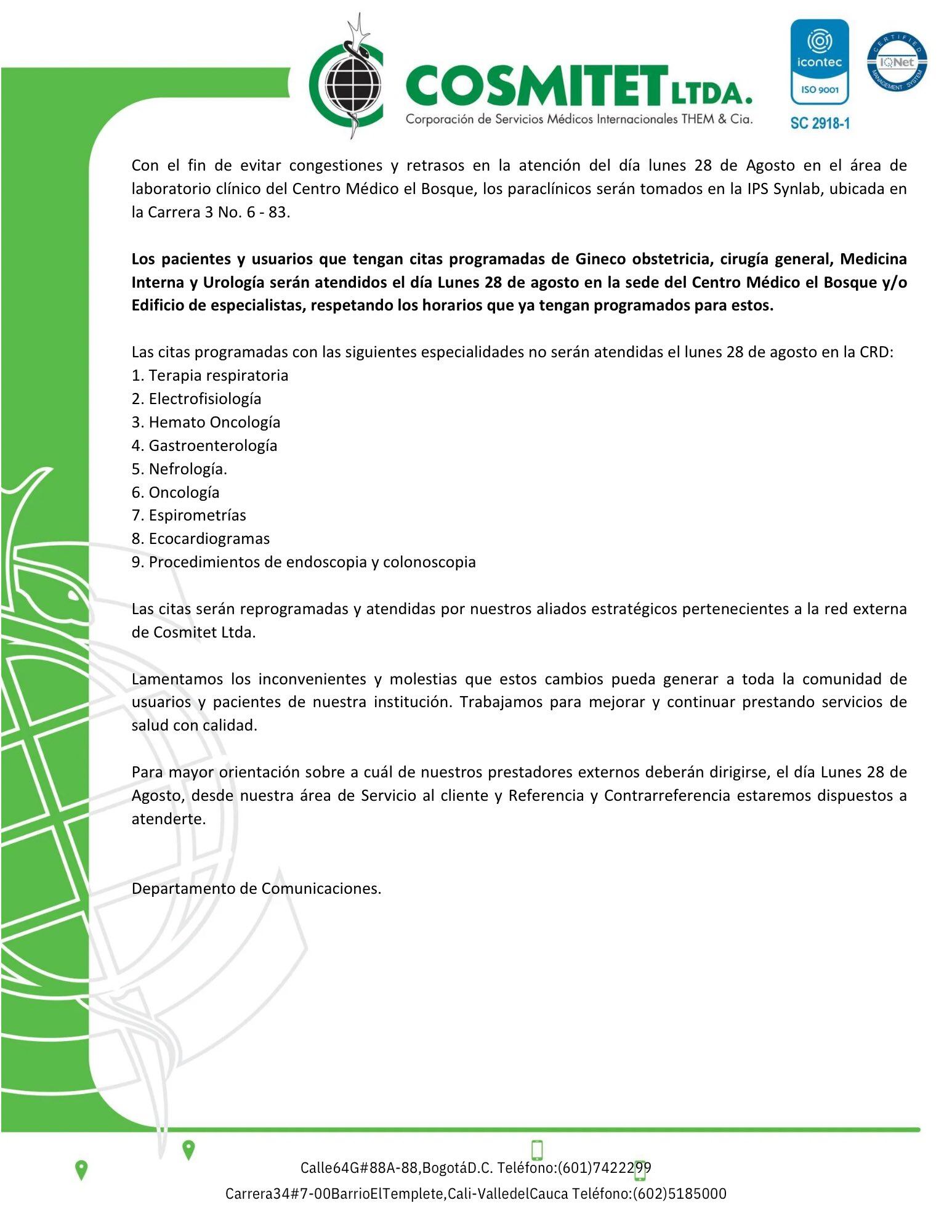 Asimismo, para las consultas prioritarias y/o entrega de medicamentos, los pacientes deberán dirigirse al Centro Médico El Bosque, que se encuentra en la Calle 5 # 39 - 00.