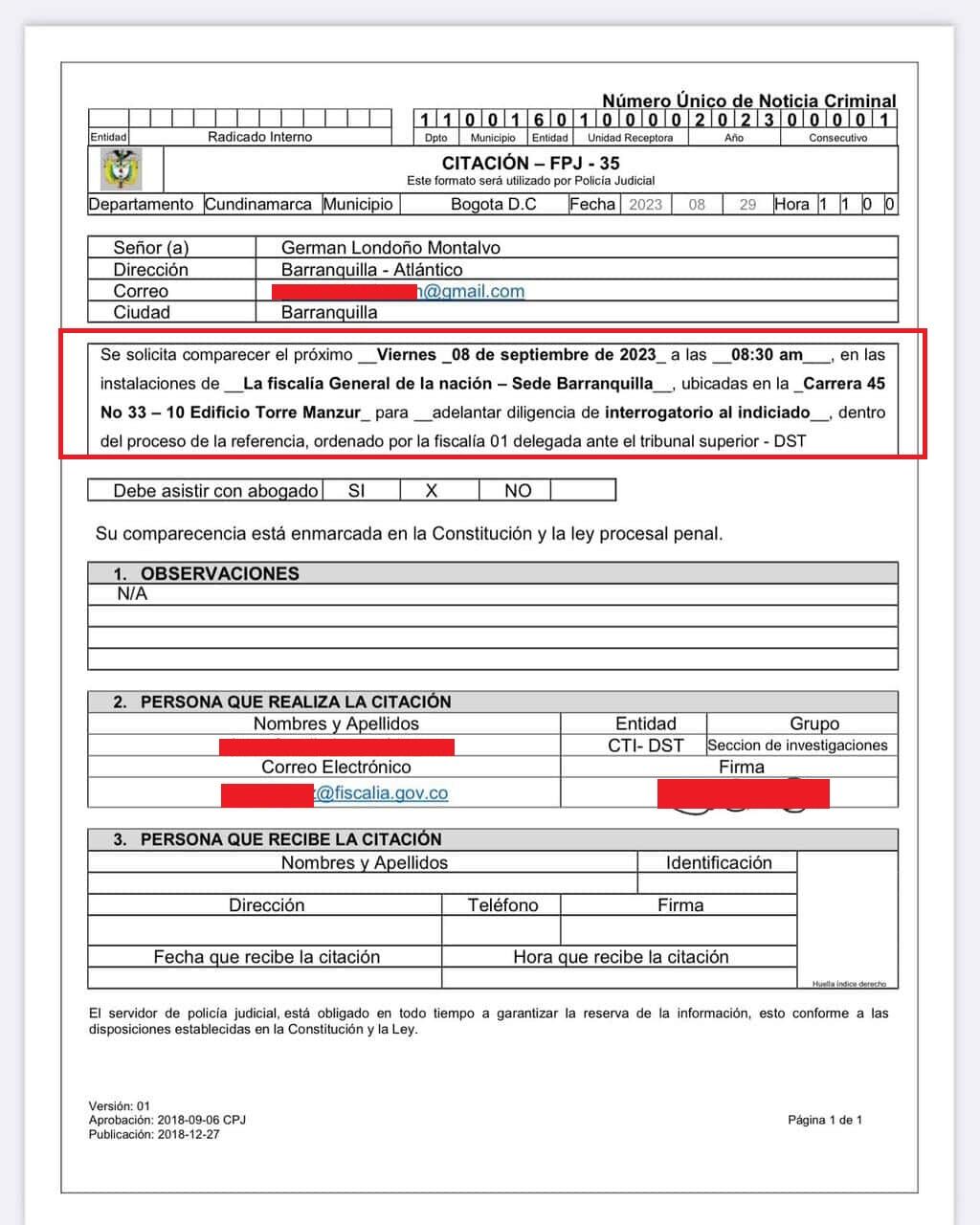 La diligencia quedó programada para el 8 de septiembre a las 8:30 en la Fiscalía de Barranquilla.