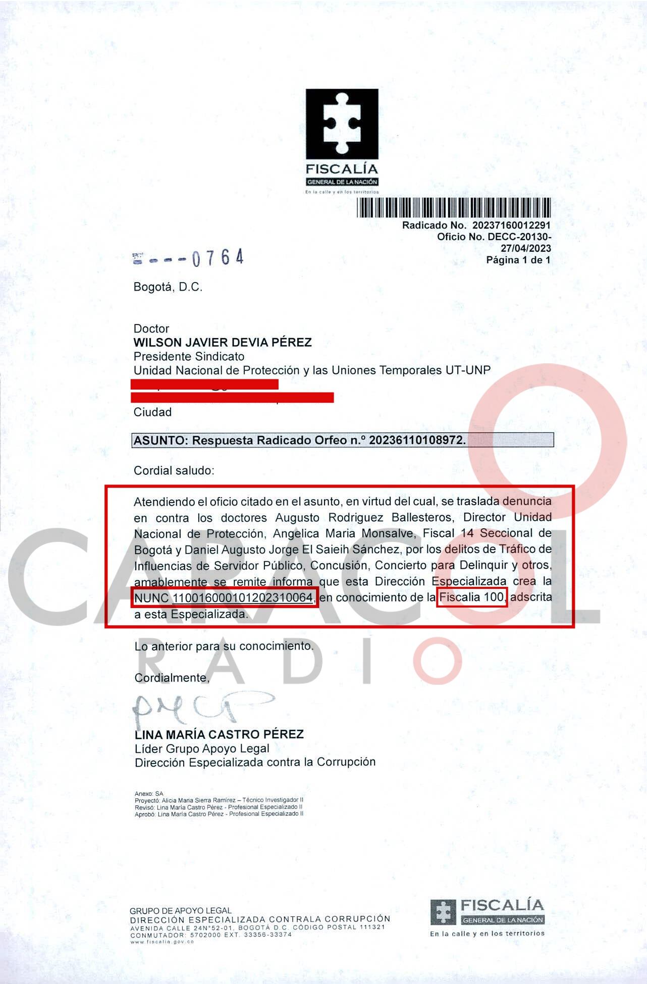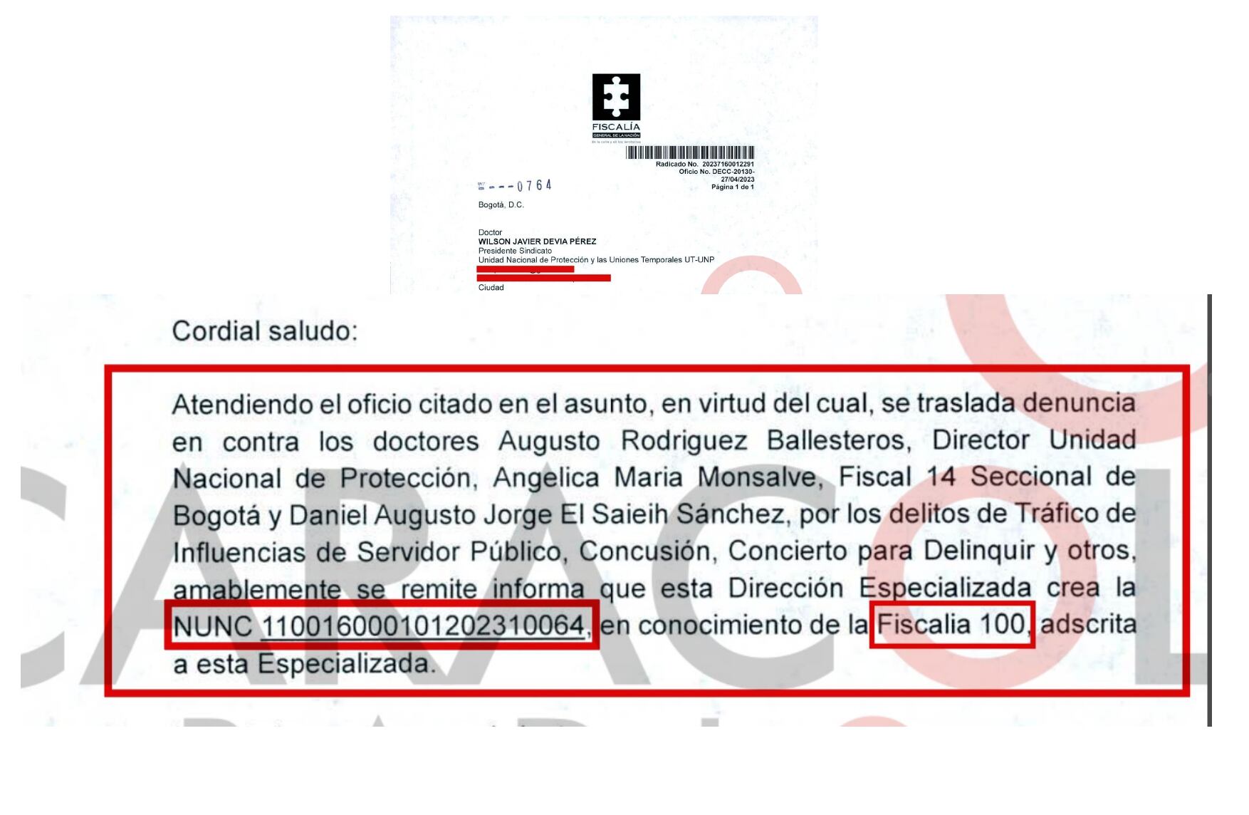 Caracol Radio conoció un oficio de la Fiscalía donde consta que, no solo se investiga a la fiscal Angélica Monsalve, también al director de la UNP Augusto Rodríguez y al jefe jurídico de la UNP, Daniel Augusto El Saieih, por los delitos de Tráfico de influencias de Servidor Público, Concusión, Concierto para Delinquir y prevaricato.