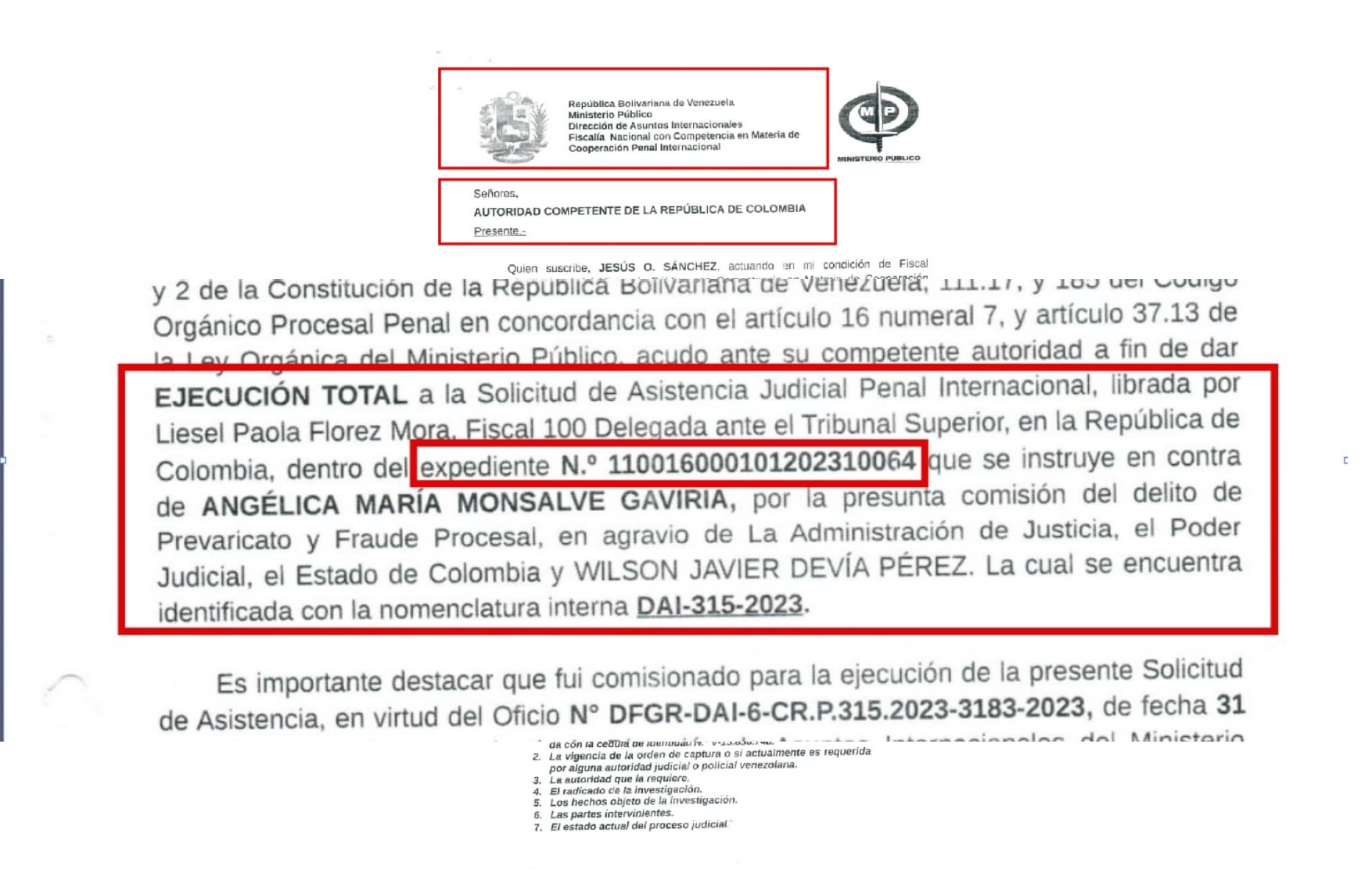 De acuerdo con la documentación, el número de radicado del expediente que se relaciona en la respuesta del Ministerio de Relaciones Exteriores de Venezuela, es el 110016000101202310064, el mismo expediente con el que se abrió indagación por las irregularidades de la fiscal Monsalve en el caso UNP.