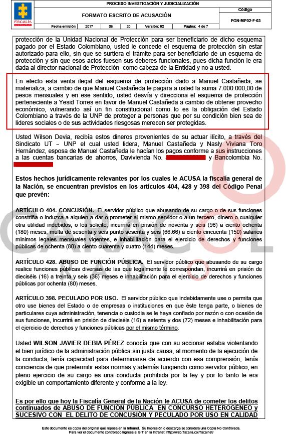 La Fiscalía radicó el escrito de acusación en contra de Wilson Devia, el 3presidente de uno de los sindicatos de la UNP, y va a juicio por los delitos de abuso de función pública, concusión y peculado, porque supuestamente negociaba con los esquemas de seguridad.