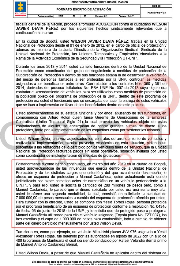 Escrito de acusación contra Wiison Devia, el sindicalista investigado por presunta corrupción en la UNP