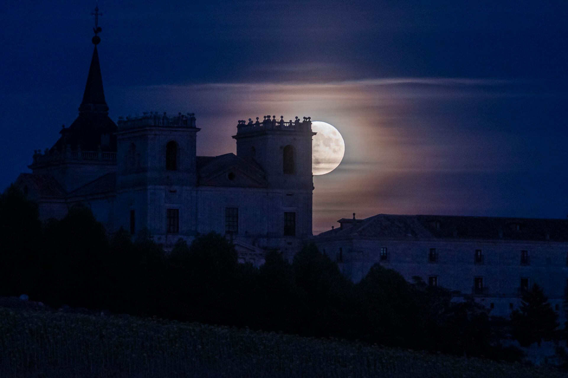 UCLÉS (CUENCA), 30/08/2023.- La superluna azul sale tras el Monasterio de Uclés, este miércoles en la provincia de Cuenca. EFE/ Fernando Villar / FERNANDO VILLAR