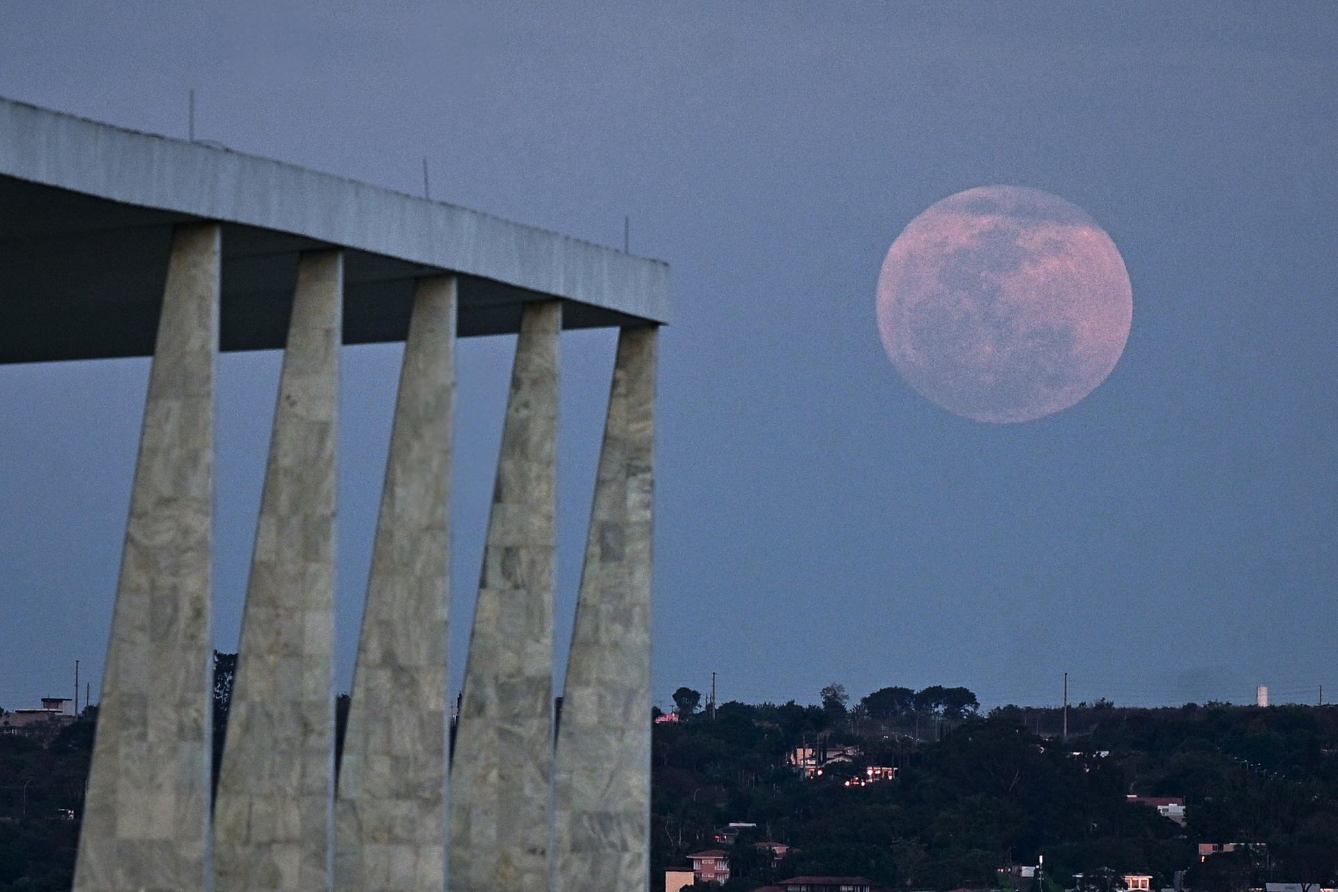 AME5455. BRASILIA (BRASIL), 30/08/2023.- La superluna azul cruza el cielo al lado de las columnas del Palácio del Planalto, hoy en Brasília (Brasil). La próxima luna azul será en 2026, pero no será superluna, suceso para el que habrá que esperar hasta el año 2037. EFE/Andre Borges / Andre Borges