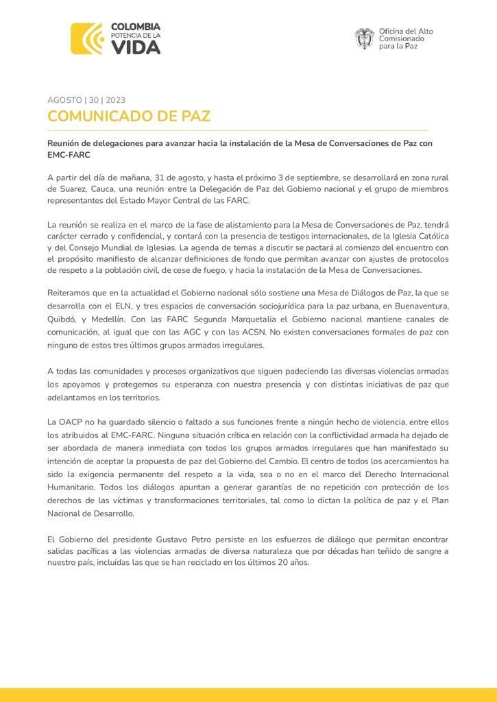En el comunicado de la oficina del Comisionado de Paz, reiteran que, en la actualidad el Gobierno “sólo sostiene una Mesa de Diálogos de Paz, la que se desarrolla con el ELN, y tres espacios de conversación sociojurídica para la paz urbana, en Buenaventura, Quibdó, y Medellín.