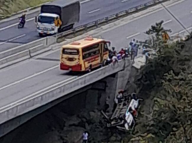 “Según información del conductor del vehículo pierde los frenos y choca con uno de los separadores de la vía ocasionándole volcamiento cayendo al otro lado del puente y por fortuna no alcanzó a caer al vacío”, relató Luis Carlos Hernández, comandante de bomberos de Amagá.