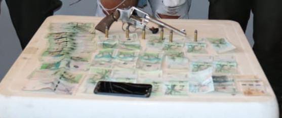 Los policías inspeccionaron el inmueble, en una de las habitaciones encontraron a un hombre con un arma de fuego en la mano, quien al ver a los uniformados la arrojó al suelo, siendo detenido, al realizarle un registro personal, en su pantalón se le halló dinero en efectivo en billetes de $100,000 para un total de $ 3.000.000 (tres millones de pesos).