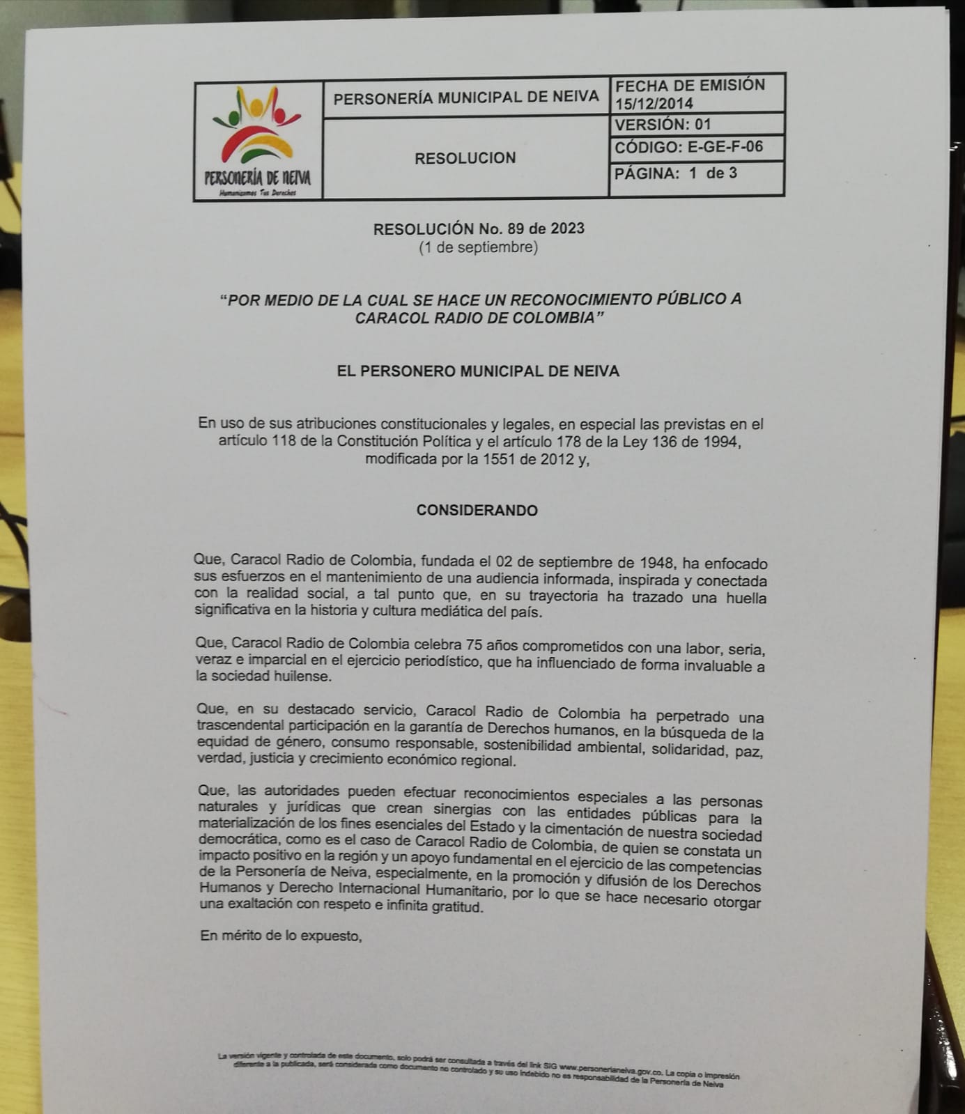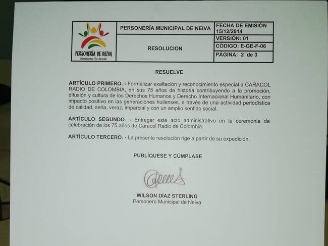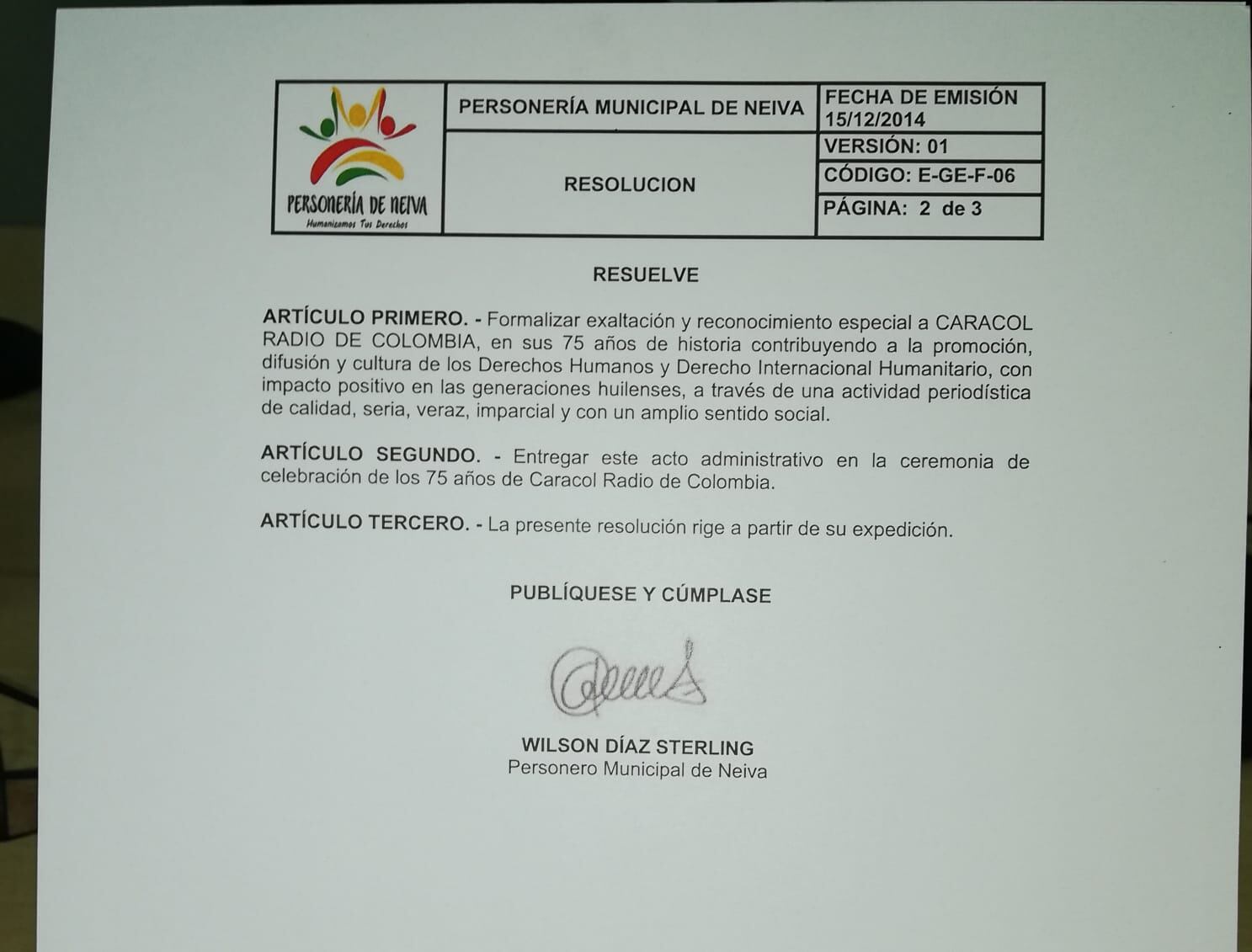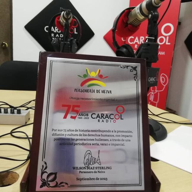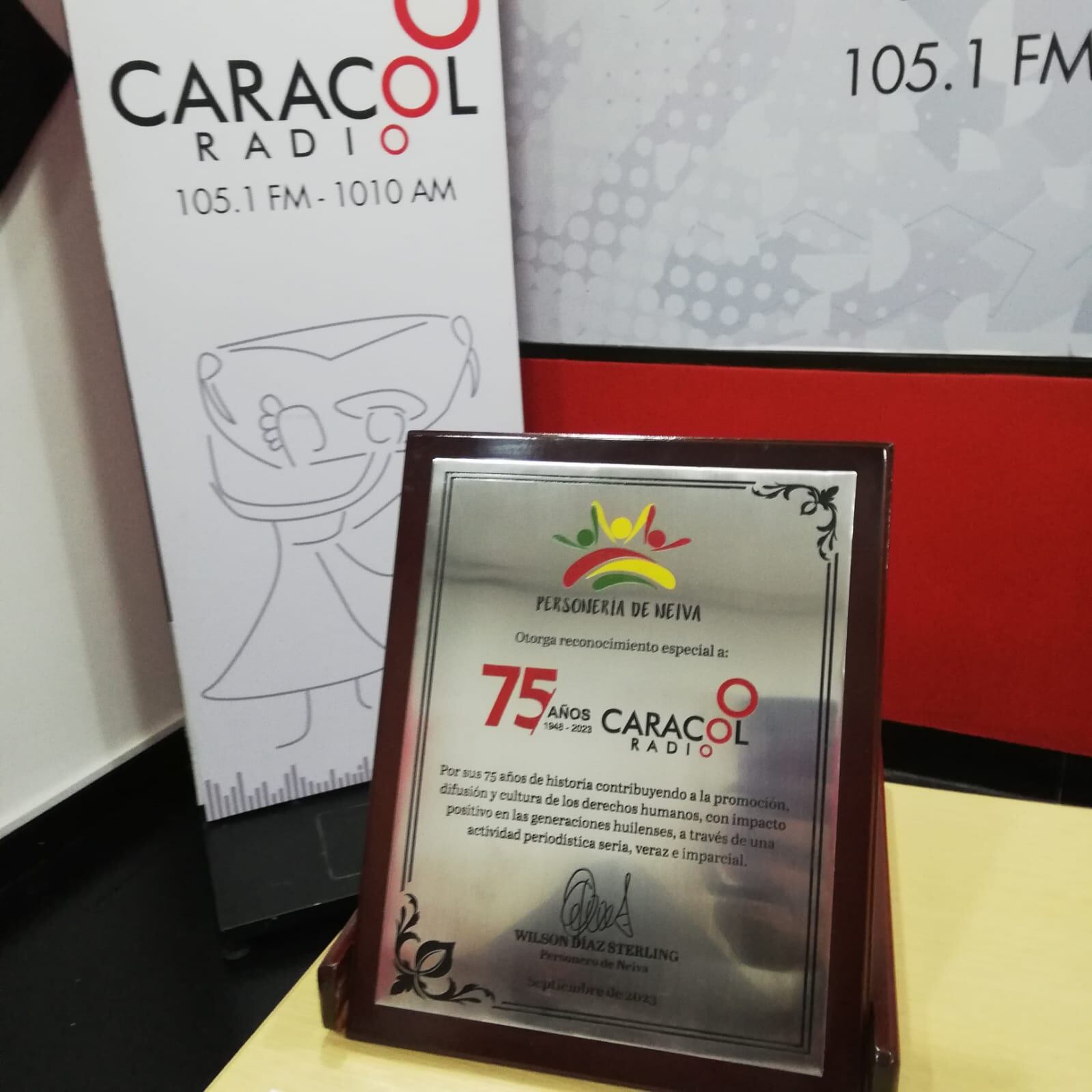 En nombre de todo el equipo de Caracol Radio en la ciudad de Neiva, queremos expresar nuestra más sincera gratitud por el hermoso reconocimiento que nos han otorgado en conmemoración de nuestros 75 años en Colombia.