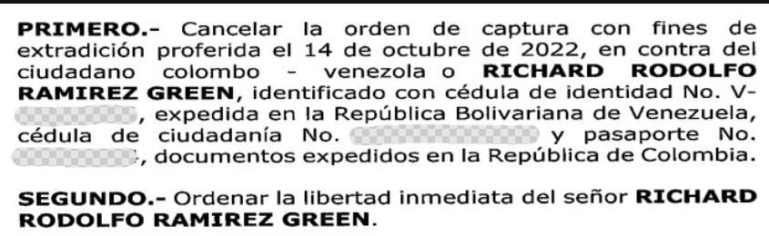 ACTUALIZACIÓN 10/11/2025 Se acusa recibo de documentación allegada posterior a la noticia publicada y, por tanto, este medio informa que: El 27 de marzo de 2024 el Gobierno Nacional expidió la Resolución Ejecutiva No. 102, revocando las Resoluciones No. 255 y No. 356 y negando definitivamente la solicitud de extradición de Señor: RICHARD RODOLFO RAMIREZ GREEN. Posteriormente, el 5 de abril de 2024 la fiscalía general de la nación, mediante oficio fechado de 5 de abril de 2025, RESOLVIÓ:
