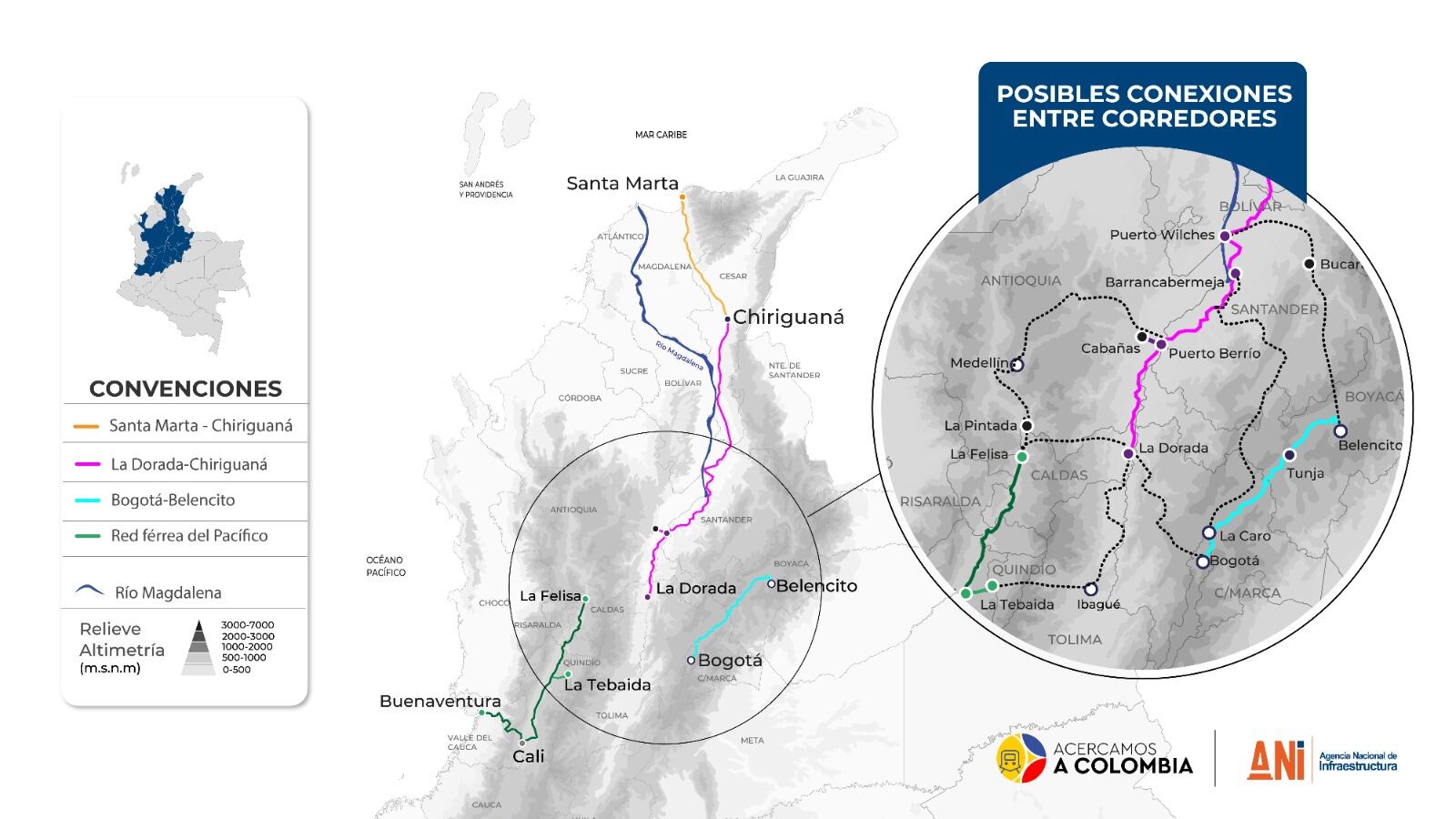 Actualmente, existen tres grandes corredores férreos: La Dorada – Chiriguaná (en operación), Bogotá - Belencito (en operación) y la Red Férrea del Pacífico (en estructuración).