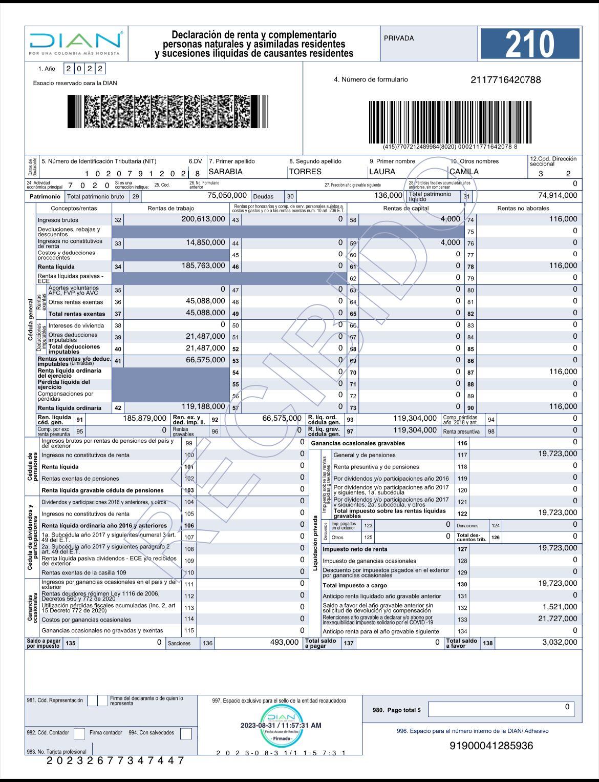 Laura Sarabia publicó su declaración de renta para posesionarse como directora de Prosperidad Social y reveló que tiene un patrimonio líquido de $74 millones, luego de restar deudas por $136.000 a los $75 millones de patrimonio bruto y a pesar de registrar un ingreso por salarios de $200.613.000, obtenidos por cuenta de salarios por $101.534.000, gastos de representación por $49.372.000 y honorarios por $42.399.800.