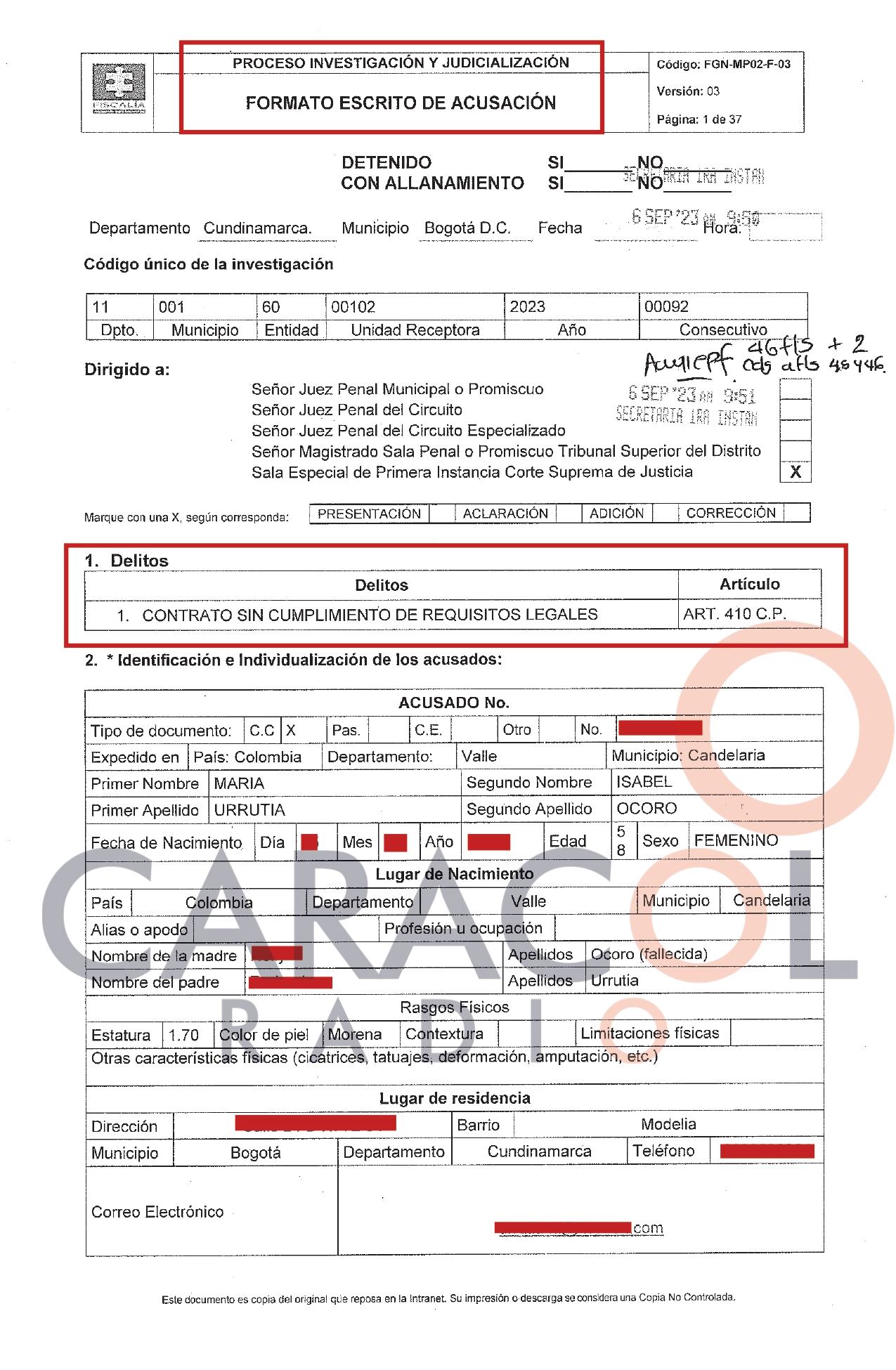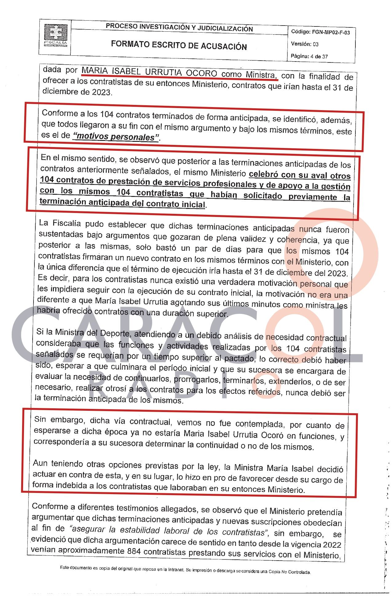 El escrito de acusación conocido por Caracol Radio dice que la exministra del Deporte, María Isabel Urrutia, va a juicio ante la Sala de Primera Instancia la Corte Suprema, por el delito de contrato sin cumplimiento de requisitos legales, por haber firmado en horas de la noche y de manera “express”104 contratos, presuntamente de manera ilegal.